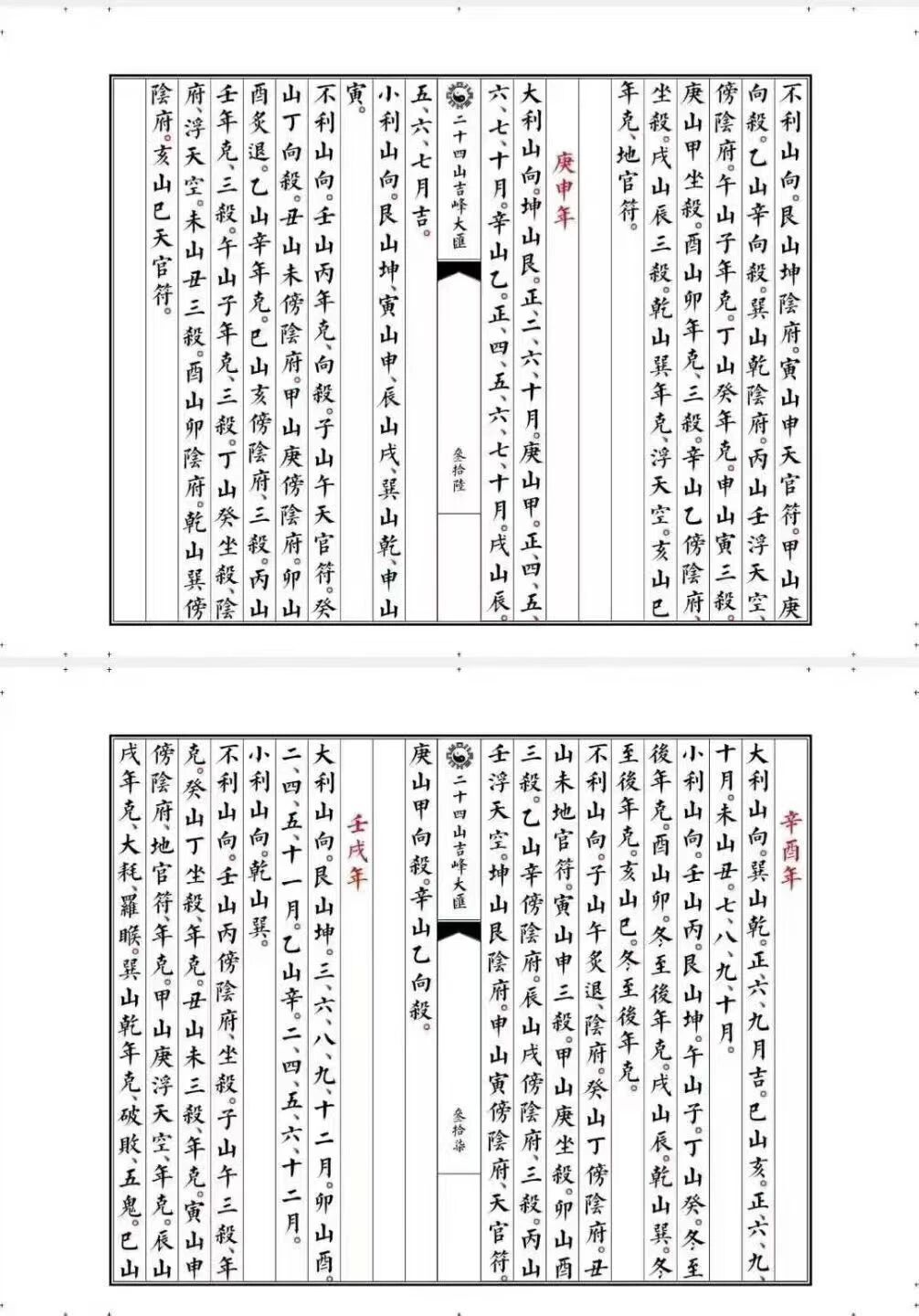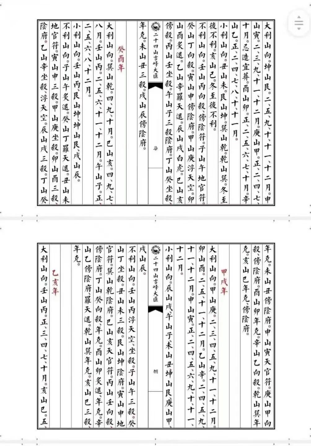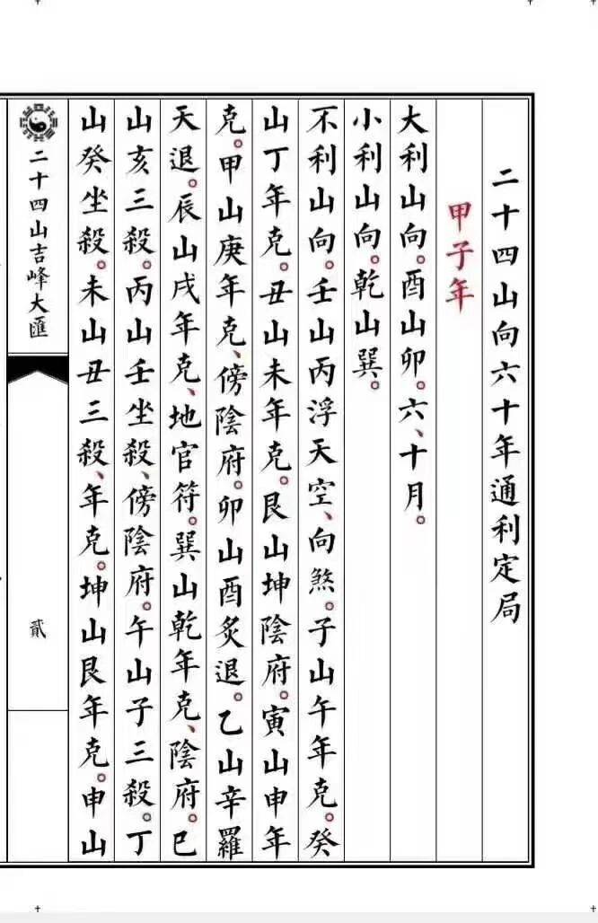 全书以 “二十四山” 为脉络,220 页的篇幅里,无冗余内容、无关键缺失,将复杂的山向水口知识拆解为清晰易懂的定局与断法,形成从理论到实操的完整体系。开篇即收录 “万年图山向通利便览定局”,以时间为轴,标注不同年份山向的通利规律,为选址择向提供跨年度的参考依据;紧接着 “二十四山向六十年通利定局”,细化至六十年周期内的山向吉凶变化,精准匹配不同时期的地理布局需求,让 “择时择向” 不再依赖模糊经验。