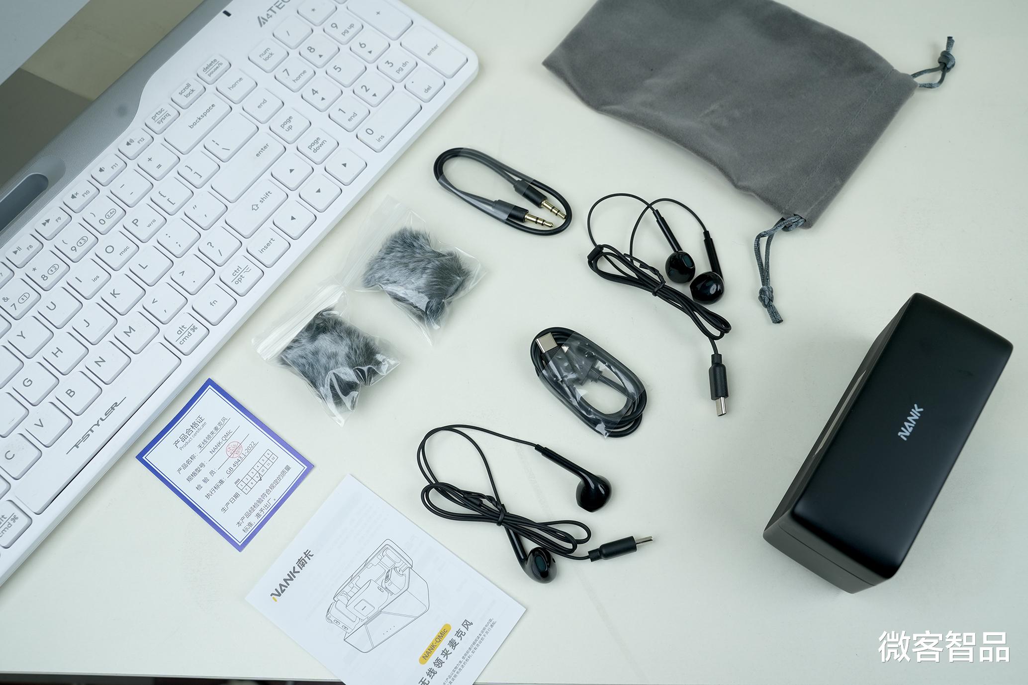 南卡Qmic的包装简约大气,白色盒身清晰标注核心功能,打开后配件丰富到无需额外采购:两个麦克风发射端、一个接收端、充电仓、防风帽、Type-C充电线、两副监听耳机、3.5mm音频线、Lightning/Type-C双转接头及收纳袋,从手机到相机、电脑,全设备适配一步到位,新手到手即可开工。