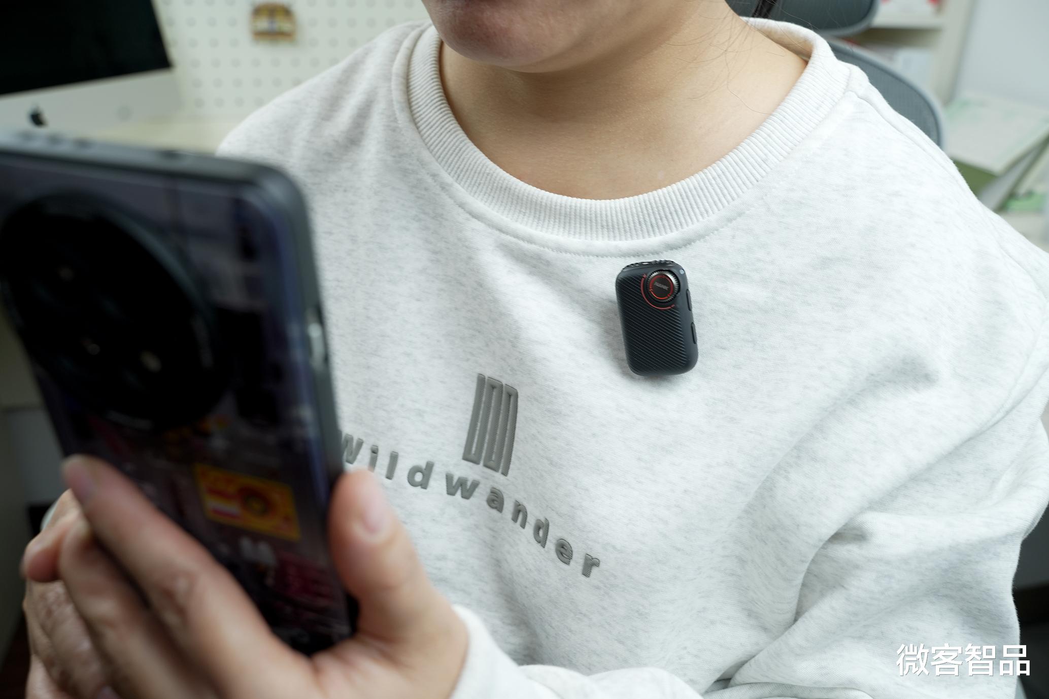 麦克风发射端仅23g重,表面磨砂ABS材质触感细腻,斜纹设计兼具防滑与质感。佩戴方式十分灵活,领夹+磁吸双模式适配不同场景:夹在衣领上稳固不松动,剧烈活动也不会脱落;吸附在金属灯杆、相机机身上时,能轻松解决厚毛衣、运动服等难夹衣物的佩戴难题。发射端侧面的实体按键操作简单,正面的20档增益轮滑调节阻尼适中,以1.0dB精度覆盖-10dB至+10dB动态范围,可精准匹配不同收音距离与环境音量。