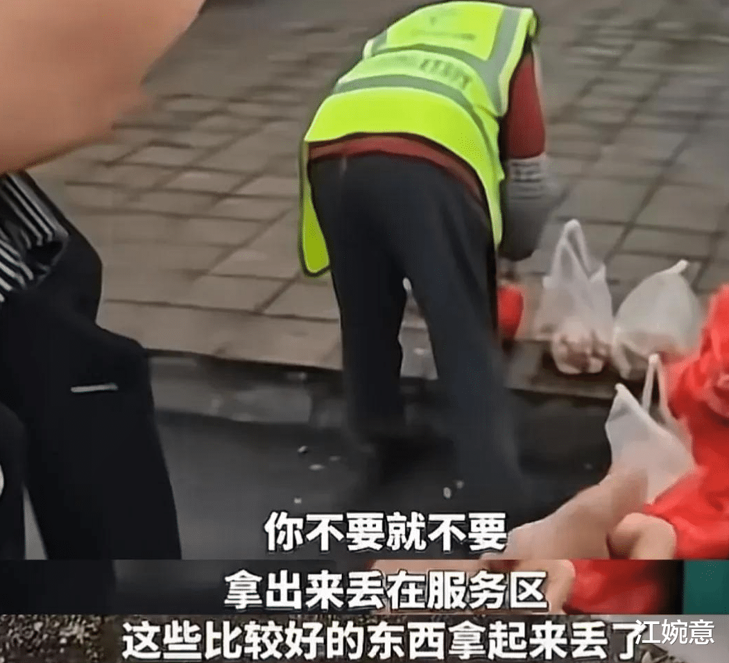由于她是自驾开车从贵州回黑龙江的,正值返程高峰期,所以在路上还遇到了堵车,因此到了这个服务区后,她担心回去路上的时间太久,这些东西会变质发臭,浪费掉会非常的可惜,她就把一些容易变质的东西丢在了垃圾桶旁边,想让环卫工人看到后能够拿回去吃。
