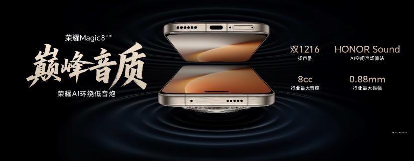 可靠性方面,荣耀Magic8系列配备荣耀巨犀玻璃,10倍抗跌耐摔,获得“SGS整机抗跌耐摔”五星认证,并支持IP68、IP69和IP69K,获满级防尘防水认证;音质方面,荣耀首创开放音腔技术,加上行业顶级双1216扬声器,搭配自研AI声场算法,带来澎湃有力的环绕低音炮巅峰音质。