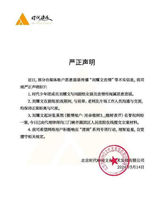 时代峰峻公司的声明中明确指出,刘耀文在剧组期间,无论是与前辈、老师还是工作人员,都保持着专业而恰当的距离。他专注于自己的工作,不受外界传言的干扰。同时,公司还透露,已经就名誉权纠纷案向法院提交了相关材料,准备通过法律手段来维护刘耀文的合法权益。