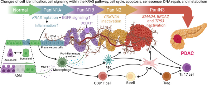 在胰腺导管腺癌(PDAC)的形成过程中,胰腺上皮内肿瘤(PanIN)的进展和微环境发挥着重要作用。正常情况下,导管细胞能够转分化为腺泡细胞,这是胰腺为了维持其正常功能所进行的补偿性再生过程。同时,在炎性巨噬细胞通过分泌基质金属蛋白酶(MMP)刺激的作用下,高度可塑性的腺泡细胞能够通过化生过程(即腺泡到导管的转变)转化为导管细胞。在致癌KRAS突变的存在下,这些细胞保持其导管表型,并随之增强表皮生长因子受体(EGFR)信号传导,同时伴随肿瘤抑制基因(如CDKN2A、TP53、BRCA2和SMAD4)的失活,最终形成原位癌。