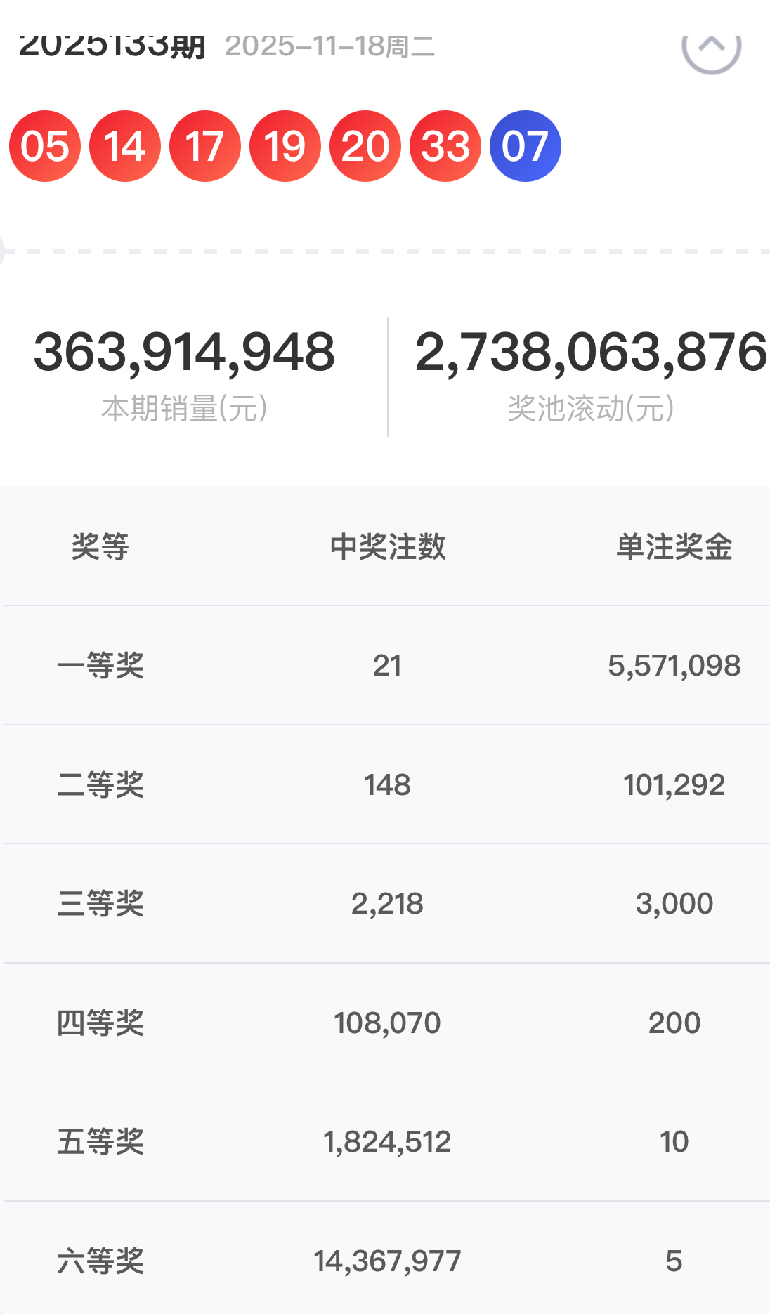 中国福利彩票双色球游戏②⓪②⑤133期开奖信息