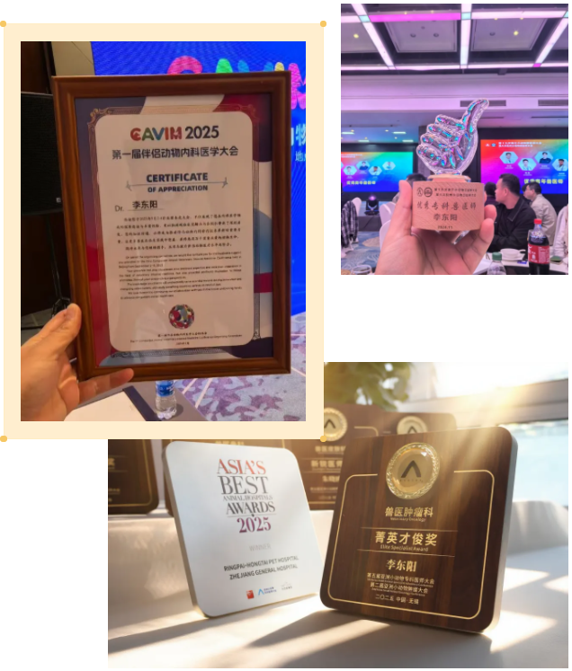 2024年首届亚洲小动物肿瘤专科医师大会“菁2024年第19次浙江小动物兽医师大会“优秀专科兽医师”,2025年东西部兽医师大会“年度口碑之星”,英才俊奖”,2025年第二届亚洲小动物肿瘤大会“菁英才俊奖”。
