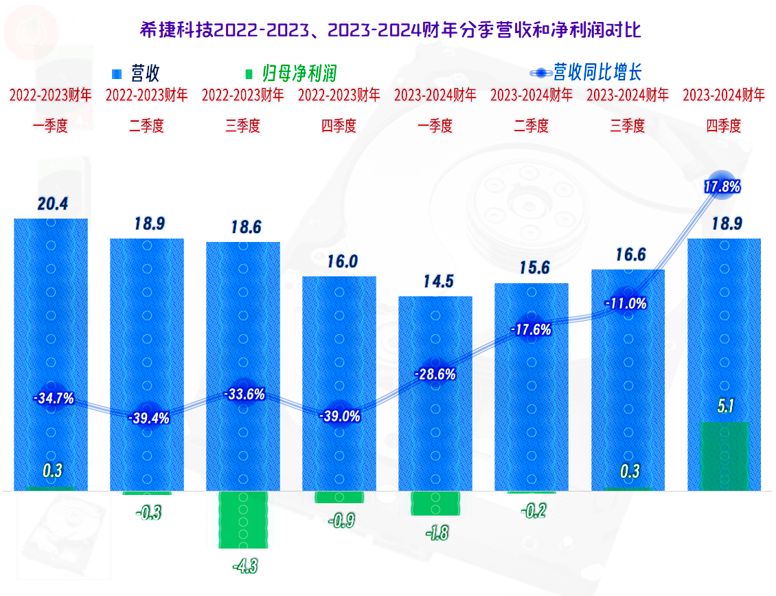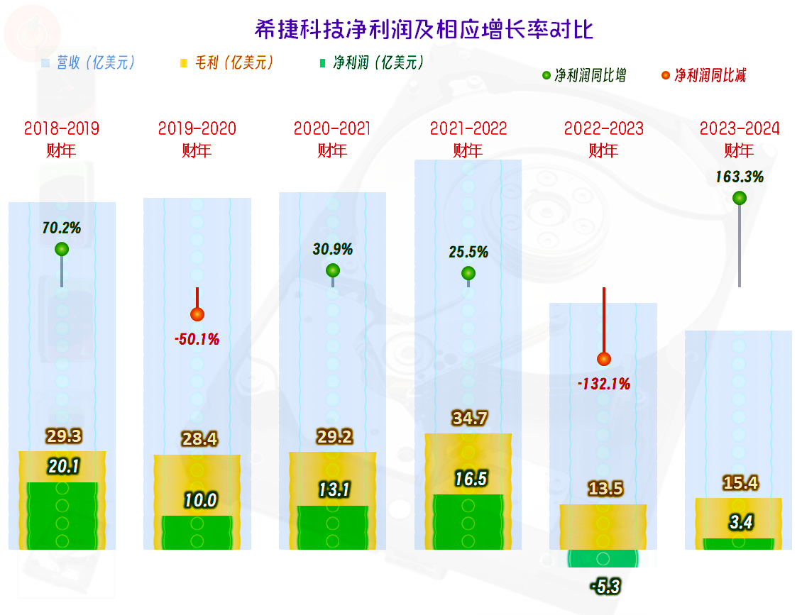 在2022-2023财年亏损后,希捷科技在2023-2024财年稳住了这种形势,小额盈利了3.4亿美元。能如此快地扭转亏损形势,还是体现出其不错地应对市场下行的能力。