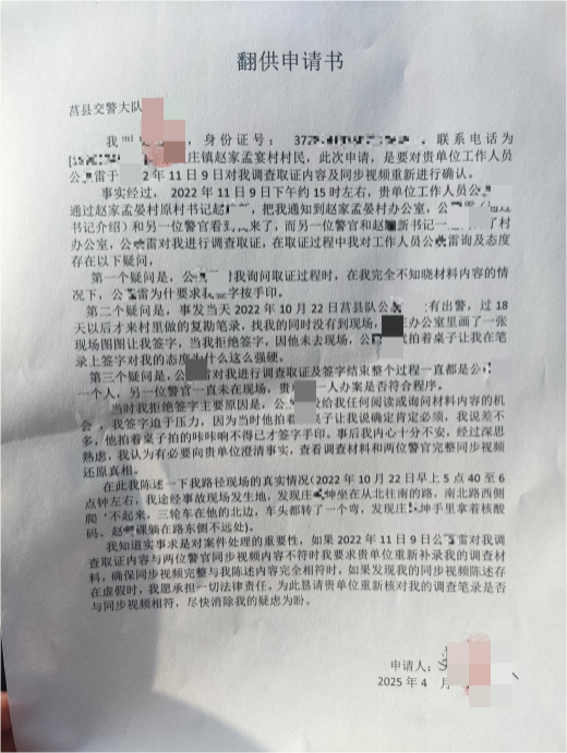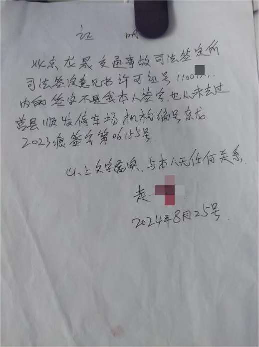 公某无视权威结论,绕过合法程序,两次委托无国家级资质的北京龙晟交通事故司法鉴定所鉴定,还直接拒绝庄某坤方提出的重新鉴定、非法证据排除及公某回避等合法申请,程序严重违法。该机构明知现场变动、检材不实不充分,仍违规受理,不仅伪造村组织负责人赵某新的见证签字(赵某新证实未到过鉴定提及的停车场,签字非本人所签),还将庄某坤三轮车“自北向南”的实际行驶方向,虚构为“自西北向东南”,最终得出“碰撞点位于道路东半幅”的结论,为逆行认定提供关键依据。