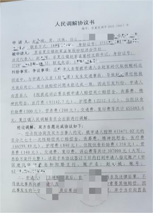 2022年10月22日清晨,大雾笼罩下的赵家孟晏村,智力残疾人士庄某坤受村委会委托,驾驶电动三轮车义务运送核酸检测物资。他沿南北走向的水泥道路自北向南行驶至村内某处时,与自南向北行驶的赵某课所驾诺贝尔牌电动二轮车相撞,造成庄某坤骨折、赵某课受伤经抢救无效死亡,两车不同程度受损。