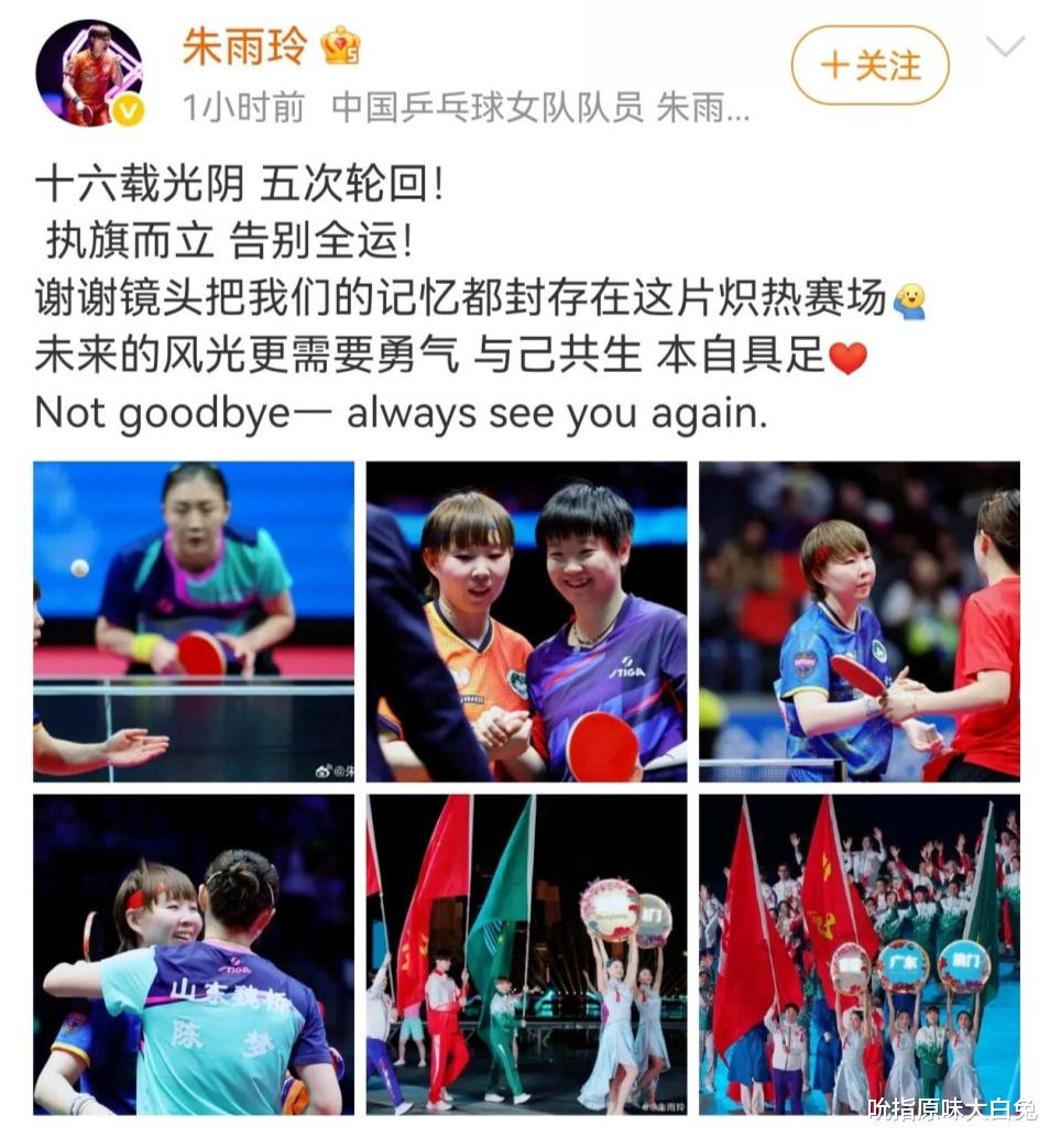 朱雨玲发文告别全运会,一共发6张照片,陈梦就占两张,看得出来两人的友谊。是默默支持的友谊,不张扬却在困难时坚定陪伴,经得起考验。就陈梦和孙颖莎而言,陈梦无论是在对战时,还是在整体评价中,在朱雨玲的心里,陈梦的分量还是要重一点。朱雨玲不仅球打的好,口才格局也是一流的,还是教授身份,不愧是能战胜病魔强者。国乒的几位小将真应该向她学习,有些队员缺少的就是那种赛场上对比赛的专注与承受,对输赢的卑亢与洒脱。
