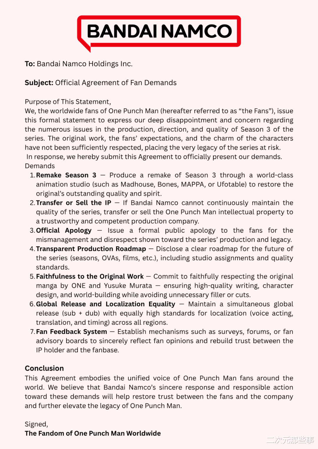 3.官方必须为第三季动画制作与口碑管理中的失职及不尊重行为,向粉丝发布正式公开道歉。
