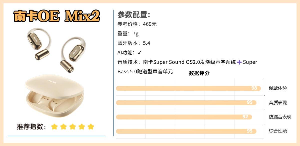 当前开放式耳机市场普遍存在佩戴舒适度不足、音质表现一般的问题,而南卡开放式耳机凭借独特的软硬件融合声学理念以及多年的技术积累,使南卡OE Mix2在舒适性和音质两大核心指标上,长期位列开放式耳机第一梯队。
