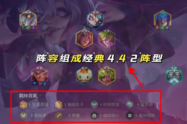 组成4复苏4时间学派2花仙子2学者的羁绊,典型的442阵型。