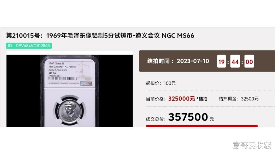 在2023年7月10号的“春秋大拍”中,就有一枚NGC评级66分的1969年“5分试铸币”,在最后拍出了357500元。