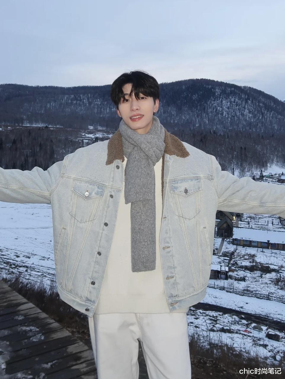 加厚款的牛仔衬衫版型外套看着就轻盈很多,实际上保暖效果一点不少,配上米白色针织上衣和白色长裤,浅灰色的围巾让穿搭更加温柔与高级。