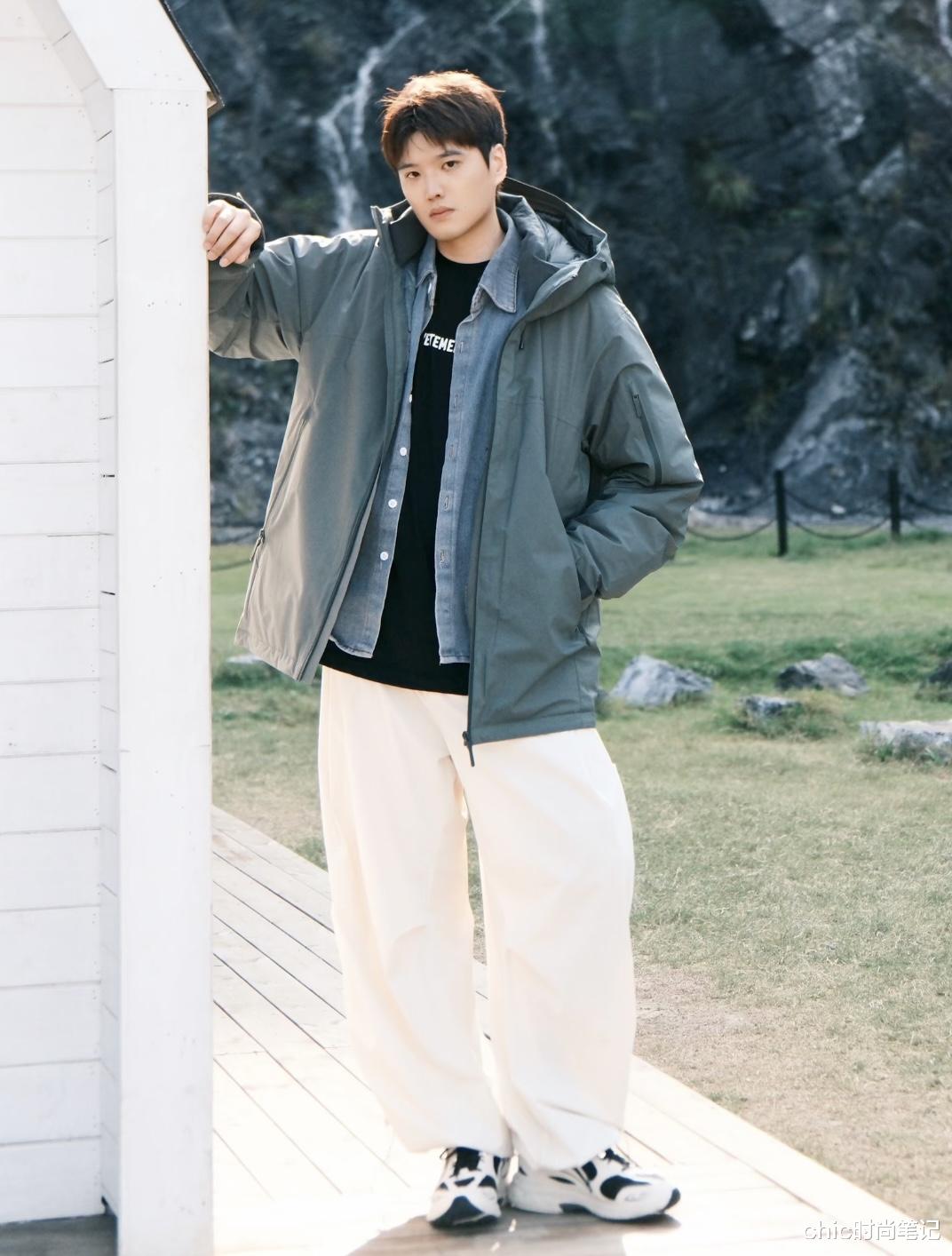 喜欢有层次感的男生看过来!还是深色系的冲锋衣外套,内搭圆领卫衣、叠穿一件蓝色牛仔外套,上身穿搭的层次感一下子多了起来,下身则是搭配米白的长裤和运动鞋,让人把视觉中心放在上半身。