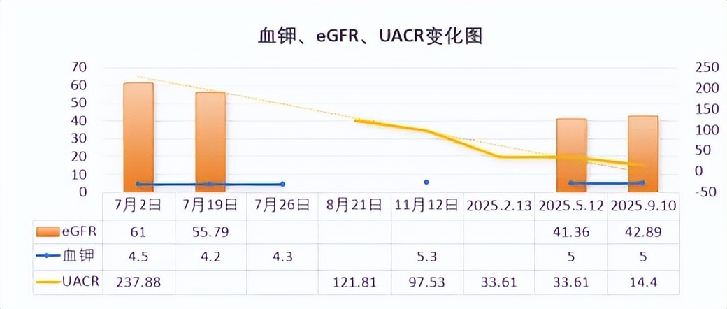 第一次随访(2024年7月19日):患者启用非奈利酮治疗2周,复查血钾稳定(4.2 mmol/L),eGFR较用药前略微下降(61→55.79 ml/min/1.73m2),降幅不到10%,患者未出现相关不良反应,治疗不调整。第二次随访(2024年7月26日):患者启用非奈利酮治疗3周,复查血钾仍稳定(4.3 mmol/L),将非奈利酮剂量调整为标准剂量20 mg qd。患者血压偏低(110/60 mmHg),目前服用药物为氨氯地平+缬沙坦,停用氨氯地平,其他治疗药物不调整。第三次随访(2024年8月21日):患者启用非奈利酮治疗1个月余,复查UACR下降明显(237.88→121.81 mg/g),患者主诉双下肢水肿情况较前减轻。治疗药物不调整。第四次随访(2024年11月12日):患者启用非奈利酮治疗4个月余,复查UACR持续下降(降至97.53 mg/g),较启用前下降57%,疗效确切。但患者血钾较前明显升高(5.3 mmol/L),我们开始权衡是否应调整非奈利酮的治疗?2024年KDIGO指南强调,发生高钾血症应积极进行降钾治疗,避免减量或停用具有心肾获益的药物[4]。结合指南和非奈利酮说明书用药指导,我们对患者进行饮食指导,减少含钾高食物的摄入,并添加降钾药物,1周内复查血钾降至4.9 mmol/L。遂继续当前治疗方案。第五次随访(2025年2月13日):患者启用非奈利酮治疗7个月余,UACR持续下降(降至33.61 mg/g),较启用前下降90%,疗效显著。第六次随访(2025年5月12日):患者启用非奈利酮治疗10个月余,eGFR降至41.36 ml/min/1.73m2。我们迅速对病情进行了分析,积极查找eGFR下降原因。由于非奈利酮导致的eGFR下降主要出现在治疗早期,与该病例情况不符合,因此此次eGFR持续下降并不考虑由非奈利酮引起(或非奈利酮不占主导作用)。从T2DM相关CKD病情本身进展来看,该病例在10个月内eGFR下降幅度达19 ml/min/1.73m2,远超疾病常规进展速度,故这种可能性也基本排除。综合患者情况分析病史,考虑患者eGFR下降与此前出现消化道相关不适及服用中药治疗有关。现患者消化道症状改善,且已停用中药。继续服用非奈利酮,监测肾功能及其他相关指标。第七次随访(2025年9月10日):患者启用非奈利酮治疗1年2个月,UACR进一步下降至正常范围(14.4 mg/g),eGFR与上次就诊相比,无进一步下降(略有回升),血钾基本稳定。考虑到T2DM相关CKD是持续进展性疾病,炎症纤维化等病理机制贯穿发生发展全程,短期治疗难以解决根本问题。CONFIDENCE研究显示,非奈利酮单药或与SGLT2i联合治疗停药后UACR水平出现反弹[5],提示非奈利酮应坚持长期应用,以使患者持续获益,除近期控制白蛋白尿外,还有助于降低远期肾心事件风险。故即使该患者UACR已达标,仍应继续使用非奈利酮。管理心得和治疗体会