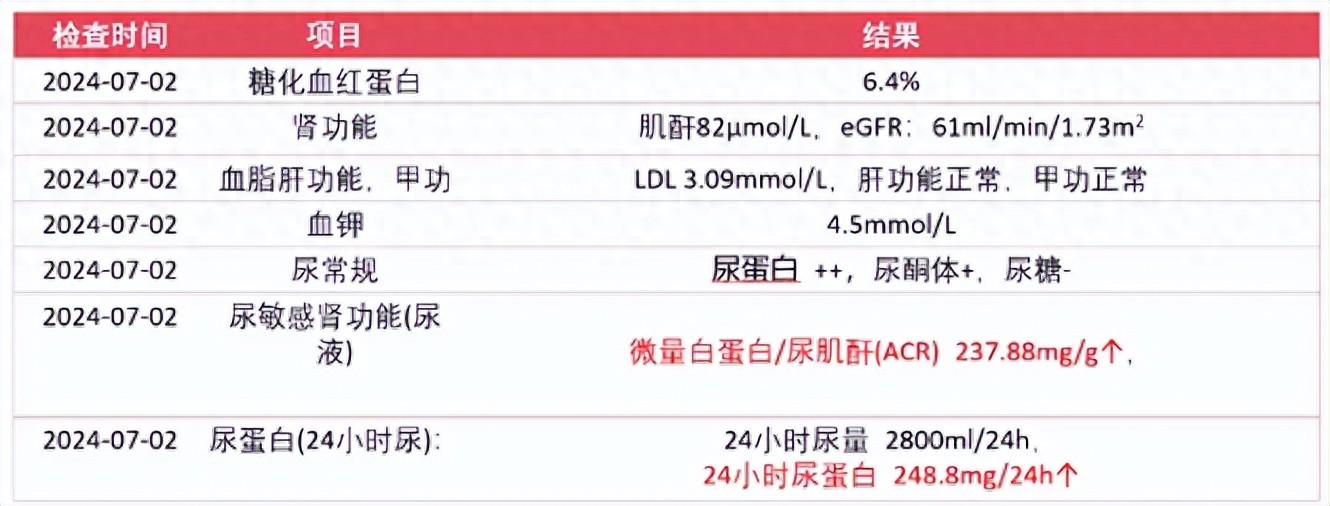 患者女,72岁,主诉“发现血糖升高17年,泡沫尿3个月”于2024年7月2日门诊就诊。