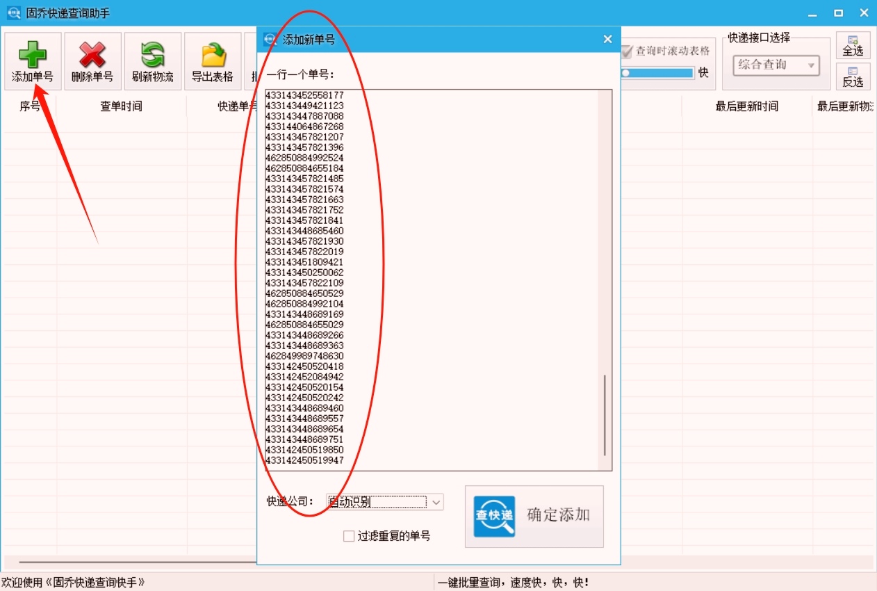 先说说我最推荐的,固乔快递查询助手,真心觉得它是性价比之王,给它打五颗星都不过分。为啥这么说呢?首先就是快,这速度真不是盖的。之前我拿 1 万条单号测试,涵盖了顺丰、中通、极兔这些常见的 15 家快递,从导入到出结果才用了 5 分钟,平均每秒能处理 33 单,这效率比人工快太多了。要是人工查百条单号,录表格得半小时,用它几秒就搞定;电商卖家查 “已揽收未发出” 的订单,人工翻找得 1 小时,它 2 分钟就筛选完了。而且它还能自动识别快递公司、过滤重复单号,自动填物流节点信息,至少能少做 30% 的无用功,不用老手动改错,省不少心。
