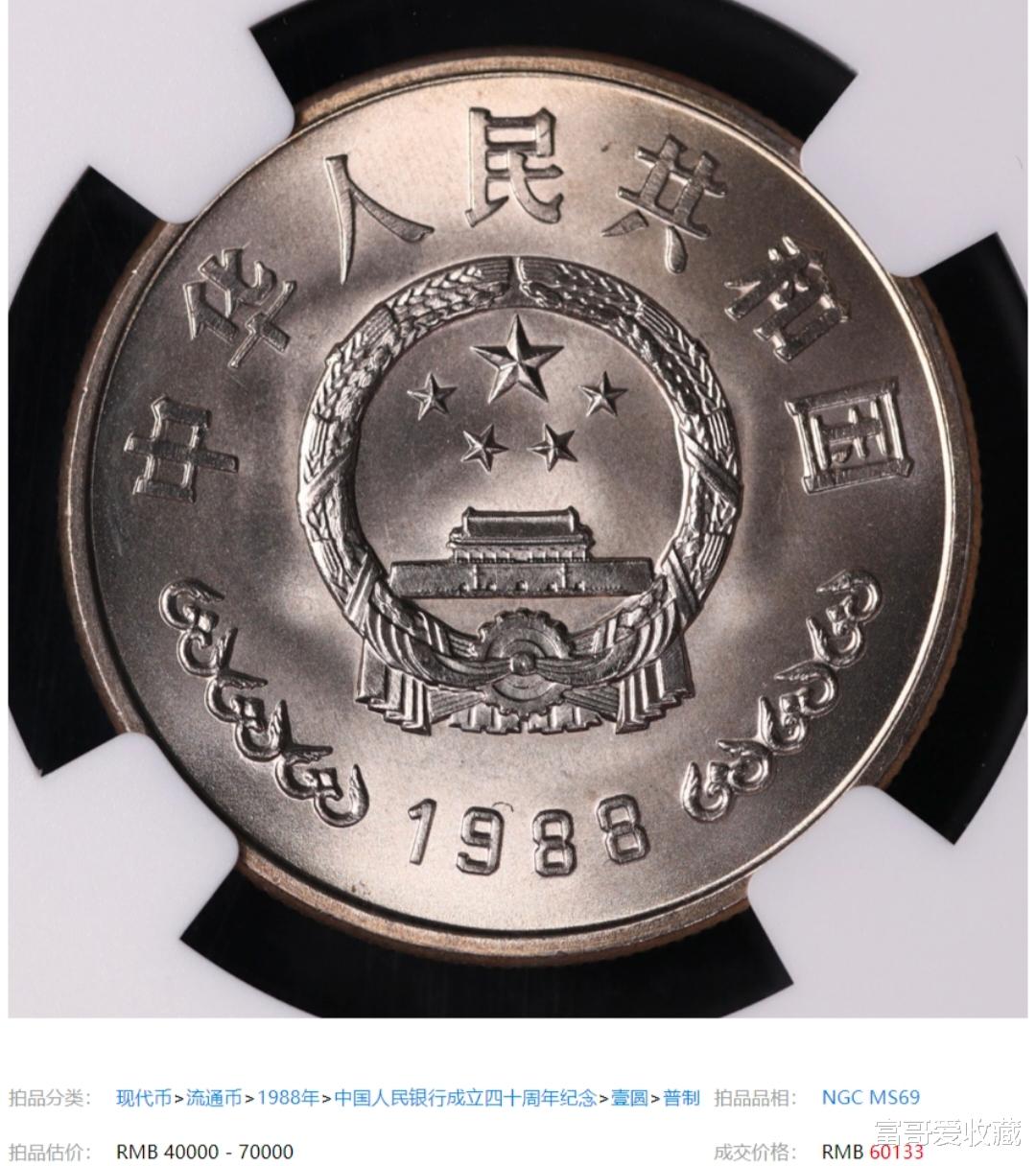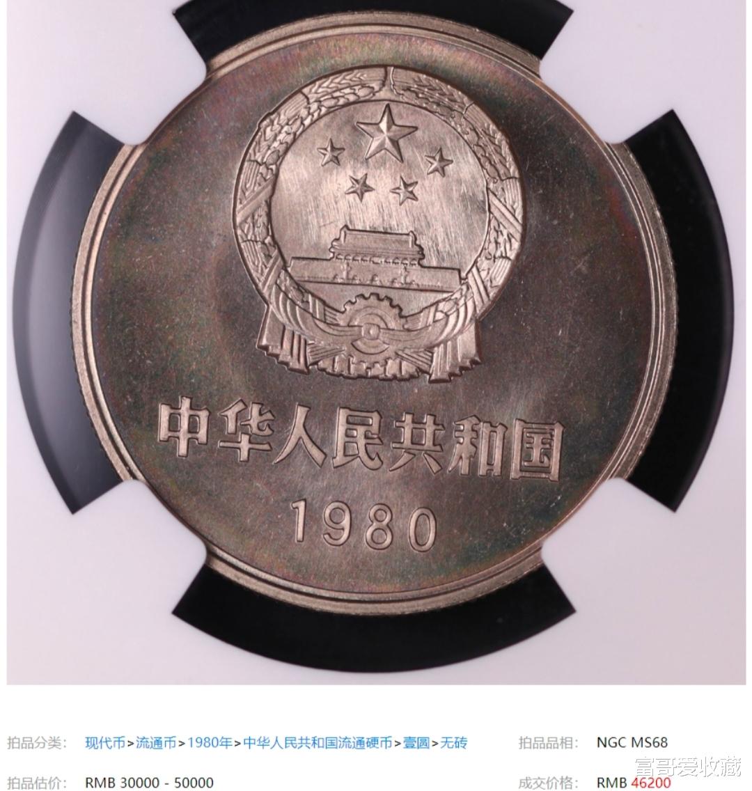 上面这枚1980年长城币1元,估价达到了5万,但最后只拍出了4.62万。