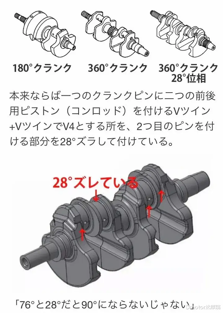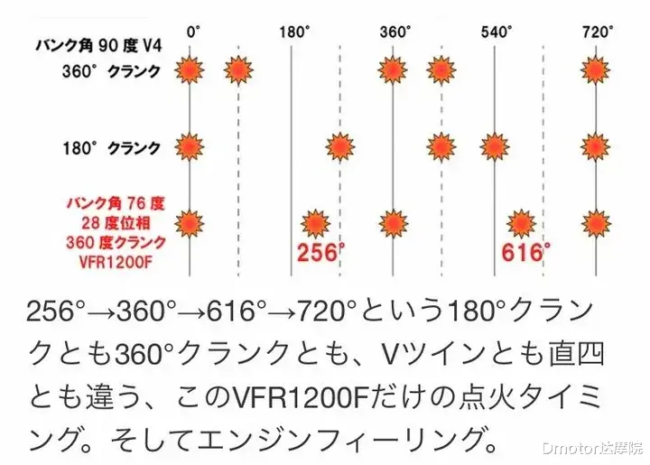 上一代VFR1200的V4是76°夹角+ 28°偏置曲轴的构造,点火变成104-256-104-256(V缸夹角76度,偏置的28度, 76+28=104度)形成Big-Bang式点火节奏,运行起来的声音会带有的节奏感,且不需平衡轴。