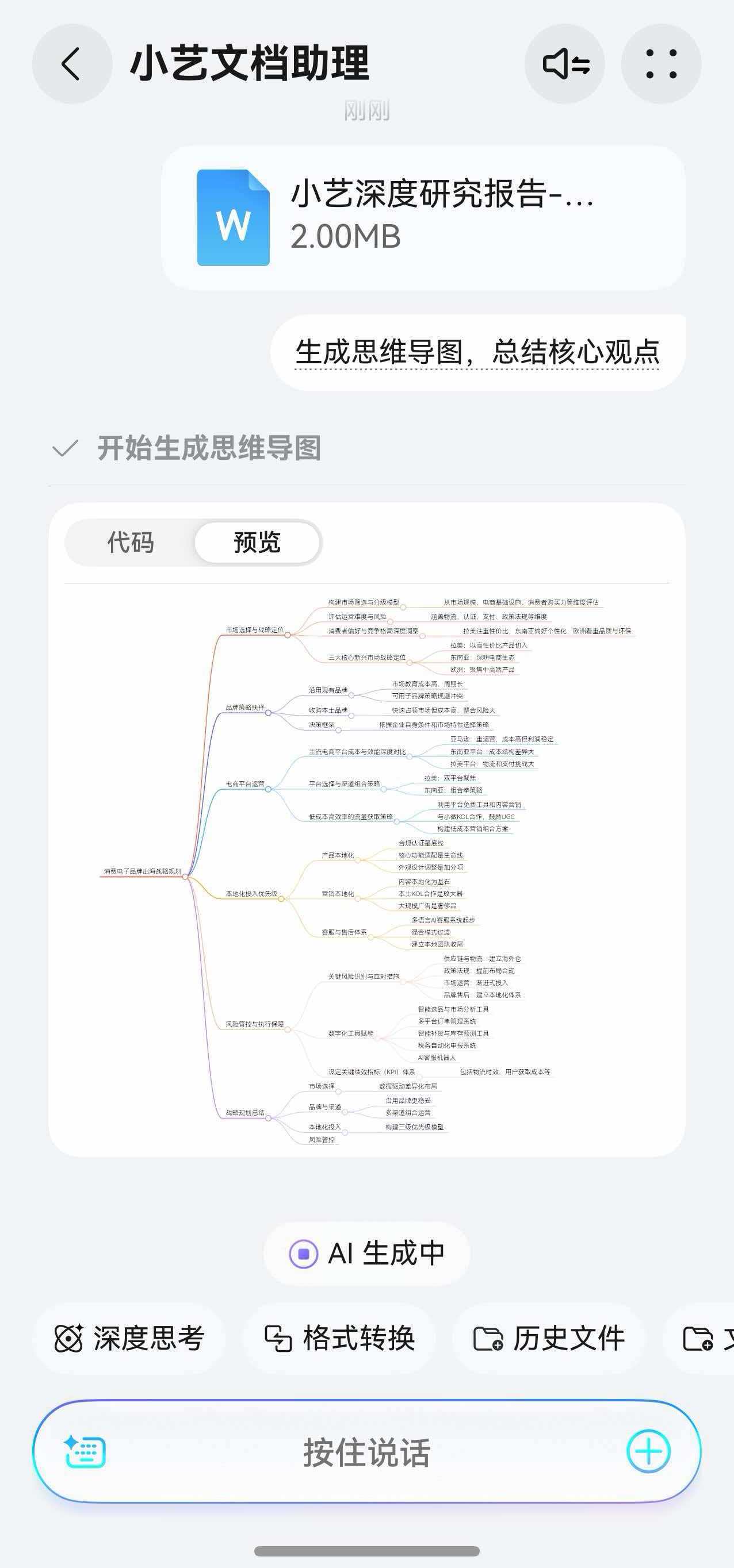 有时候我需要将一份冗长的文档整理为摘要,过去需耗费大量时间手动梳理。现在只需要把文件喂给小艺文档助理,说一句"生成思维导图,总结核心观点",它很快会给出结构化文本,并且还能精准识别段落逻辑,将大篇幅的论述精简成摘要。