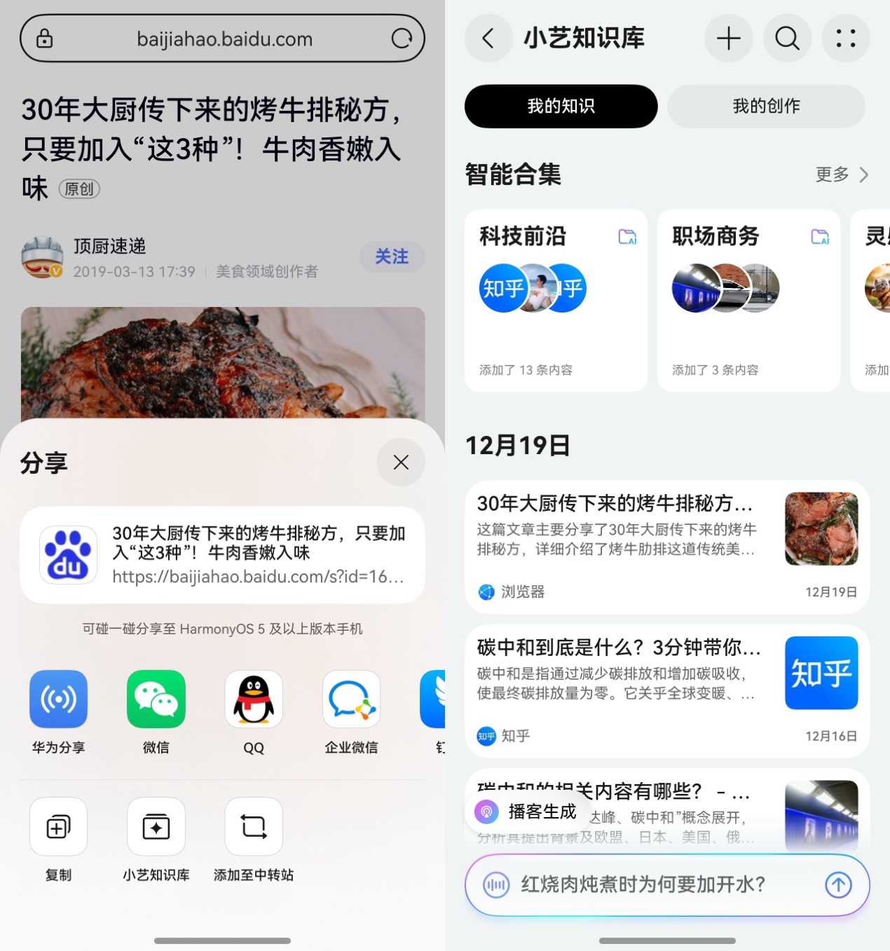 这么说大家可能感知不明显,那我就跟大家分享一下这些功能在我生活中的具体应用。像我以前特别喜欢收藏深度文章,以为保存即掌握,等到了真要动笔的时候完全找不到想要的内容。直到使用上小艺知识库的"分享记"功能,在浏览器看到有用的网页,点击"分享-系统分享-小艺知识库",就能把链接保存到小艺知识库中,还能自动创建智能合集,后续查找和管理都更加方便,找资料不用再大海捞针。