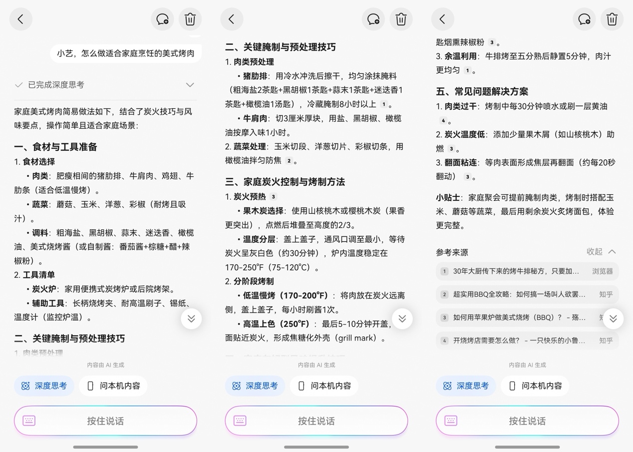 之前我刷到了一篇家庭烤肉的教程,就直接上传到了知识库,后面想做的时候只需问:"小艺,怎么在家里做美式烤肉?"它就会结合我的收藏内容和联网搜索,给到我针对性的回答。