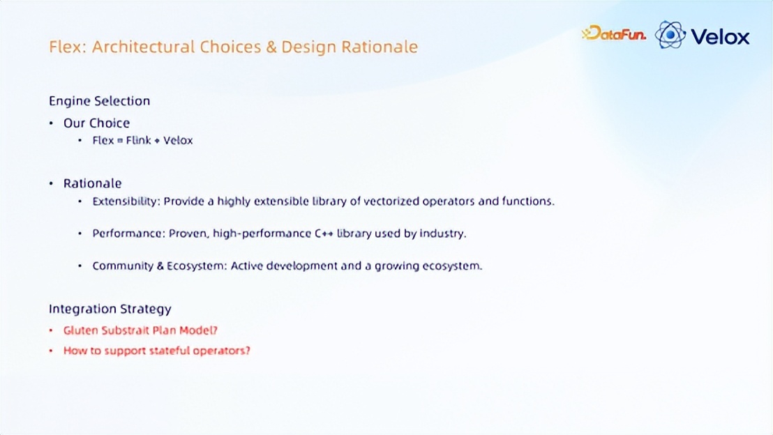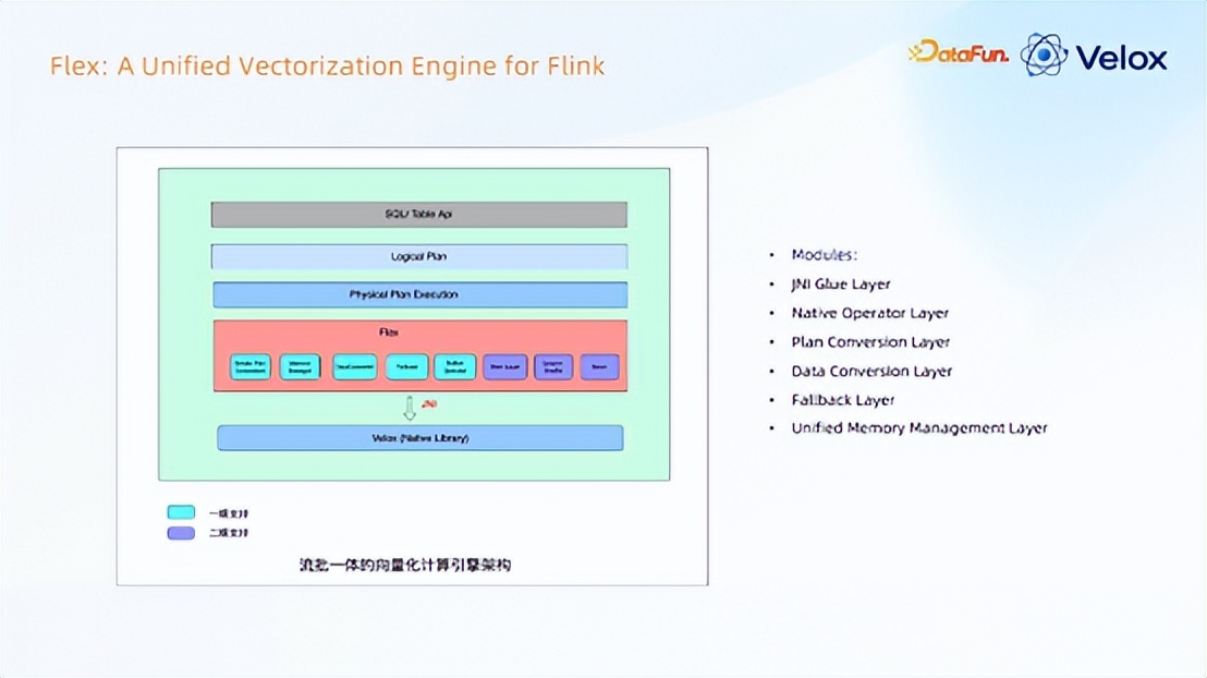 Flex = Flink + Velox验证后内部立项 Flex 项目,选型最终方案采用 Flex = Flink + Velox,Flex 是 Flink 加 Velox 的前缀,全称是 flexible 灵活单词的一个前缀,希望它做能够做到灵活可插。