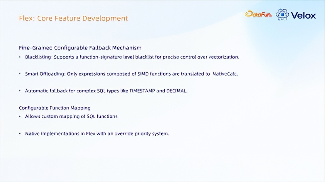 黑名单机制:支持基于函数签名级别的黑名单,实现对向量化的精准管控。智能卸载:仅将由单指令多数据(SIMD)函数构成的表达式转换为原生计算(NativeCalc)。针对 TIMESTAMP、DECIMAL 等复杂 SQL 数据类型,提供自动回退能力。Velox 里的 function 有很多类型,有些类型结果是对的,符合我们的语义,有些是不对的。支持细粒度的回退机制,以用户能够配置的方式,对函数的某些类型做细粒度的回退。Fallback 仅含有 int 函数才会翻译,考虑到正确性的问题,加上蚂蚁金融业务的特殊性,像这种容易出错的类型当前还是简单的进行,需要支持一些细粒度的回退机制。