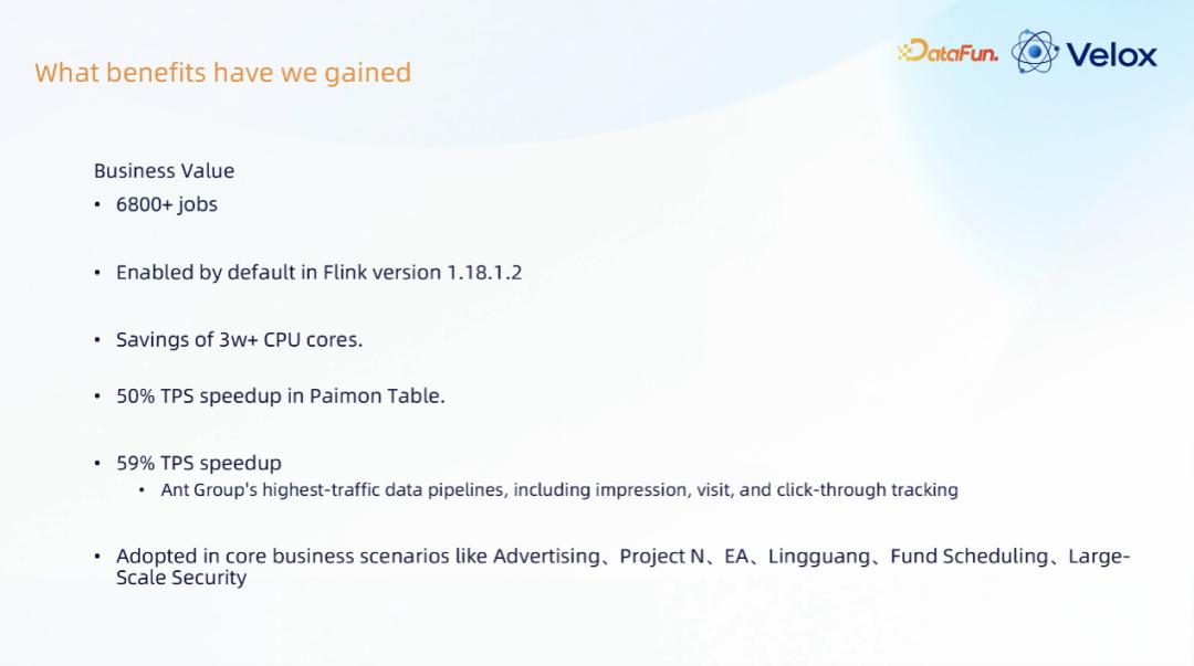 已支持 6800+ 个作业已在 Flink 1.18.1.2 版本中默认启用 节省 3 万 + 个 CPU 核心 Paimon 端到端(TPS)提升 50%目前蚂蚁最大流量的曝光、访问、点击已全面应用, 并在蚂蚁的广告投放、碰一碰、闪购、灵光平台、资金调度、大规模安全防护这些项目中应用起来。