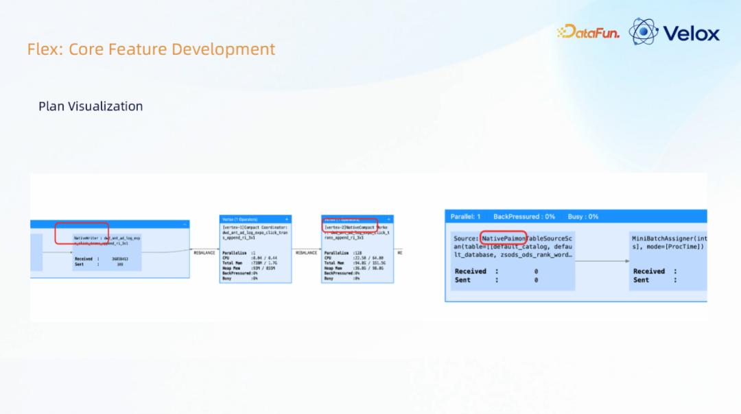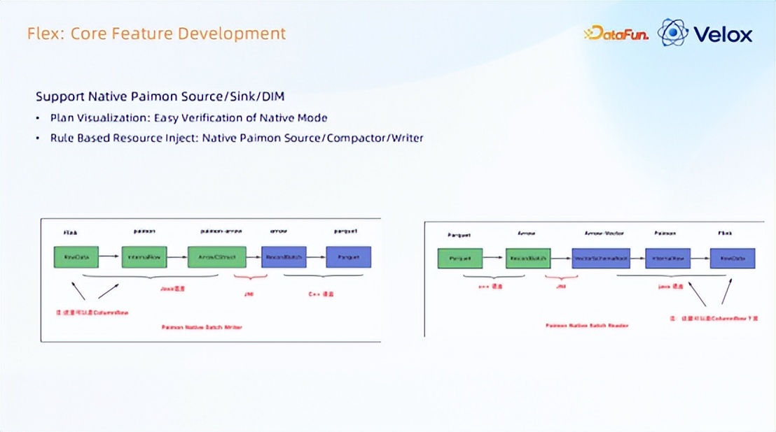 第二步是 native 原生算子,当前支持 SLS、ODPS、Paimon;其中 SLS/ODPS,它是蚂蚁内部的一个 Connector,SLS 相当于开源的 Kafka,ODPS 相当于开源里的 Hive,两者都支持以 Arrow 的方式进行数据存储。