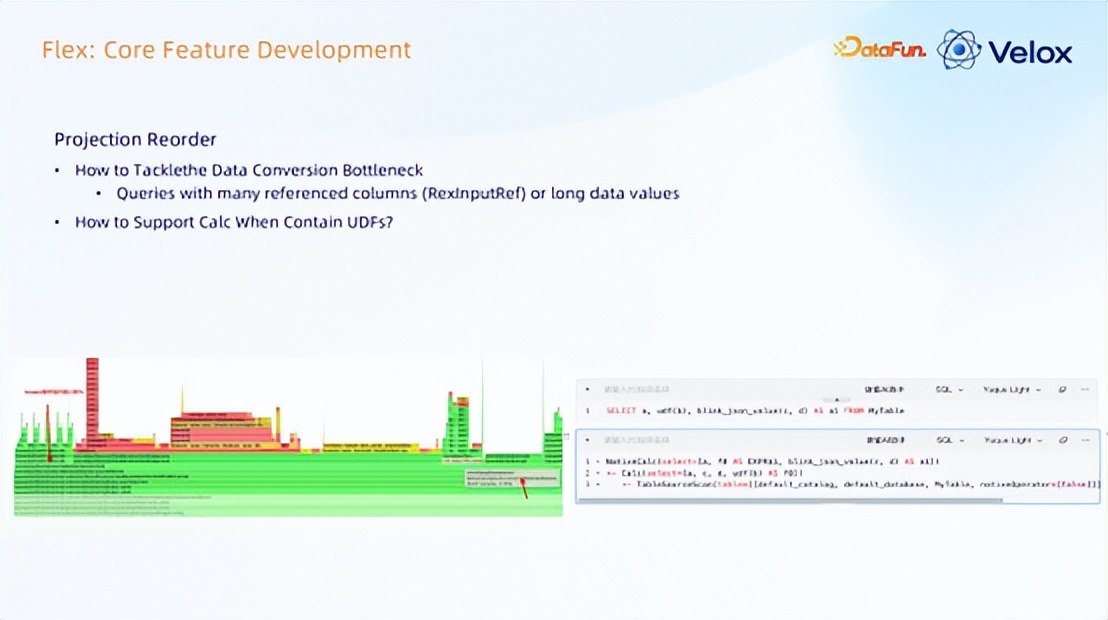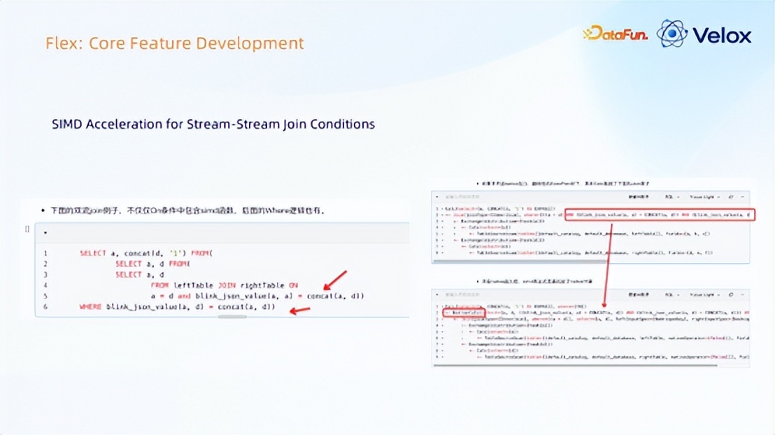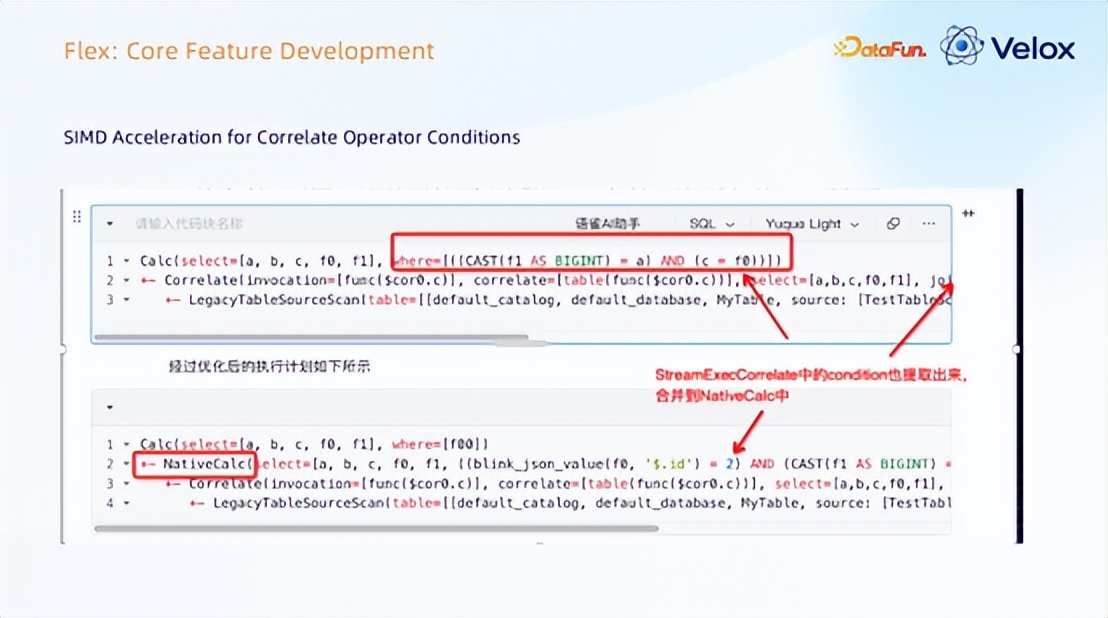 当时也对 correlation 算子做了加速,correlation 在 query 层面是子查询,内部会 rewrite 去生成 join;若是 UDFs,就不是 rewrite 的方式;在 Flink 层,correlation 本质上是一个 UDFS, UDFS 里含有它的 condition,里面会使用到 SIMD 函数。
