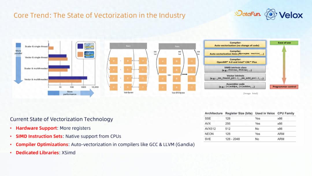 硬件支持:提供更多寄存器资源SIMD 指令集:CPU 原生支持编译器优化:GCC、LLVM(Gandiva 版本)等编译器已实现自动向量化功能专用库:xsimd 库对于计算密集型应用,向量化技术能显著加速计算效率;但对于软硬件也有相应特殊的要求与配置,如处理器方面需更多的寄存器,软件层面也需要配套。