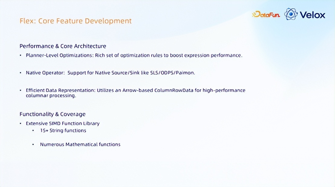 支持 SQL 函数的自定义映射。在 Flex 中提供原生实现,并配备优先级覆盖机制。比如 Flink 或 Velox,有些函数可能不一样,但是语义是一样的,就没必要重写,可通过配置执行 map 的方式处理。如果 Flex 有大量代码函数结果不正确,在 Flex 里每次编译修改开发的时间可能要几个小时;这些若在 Flex 的 CPP 模块里实现引用、原生实现,并配备优先级覆盖机制,整个编译时间可从几个小时降低到几分钟。