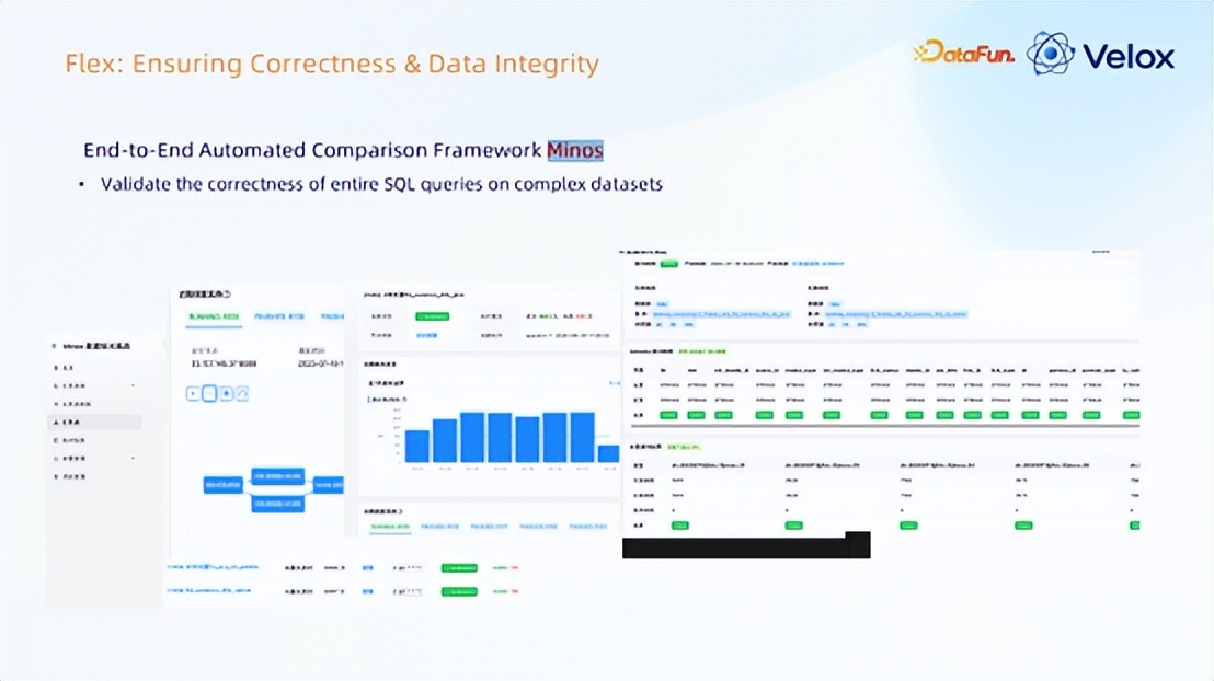 仅仅函数行为语义正确了,还是没法保证这些函数嵌在一起的时候,使用各种类型的结果能够保证正确,所以还得实现一套面向作业级别的一个自动化比对框架;25 年上半年做了 Minos 系统,它能够在作业里一键在 SQL 改写生成两个作业,把结果写到 Hive 里面,以 5 分钟为单位的分区写到 Paimon 表分区里;然后作业检查分区情况进行全量比对。