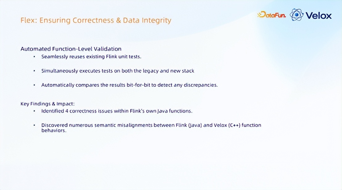 正确性问题;由于 Flink 和 Velox 是两套引擎,如何保证大量函数语义行为是对齐的?