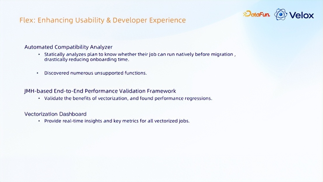 提前发现哪些 Flink 函数 Velox 是不支持的,避免上线向用户推广的时候发现大量的不支持,那对用户的体感、体验是非常差的;为此开发了一套自动编译的工具,将线上的所有 SQL 拿过来重新跑,自动化跑一遍,提前把不支持的一些函数支持掉。