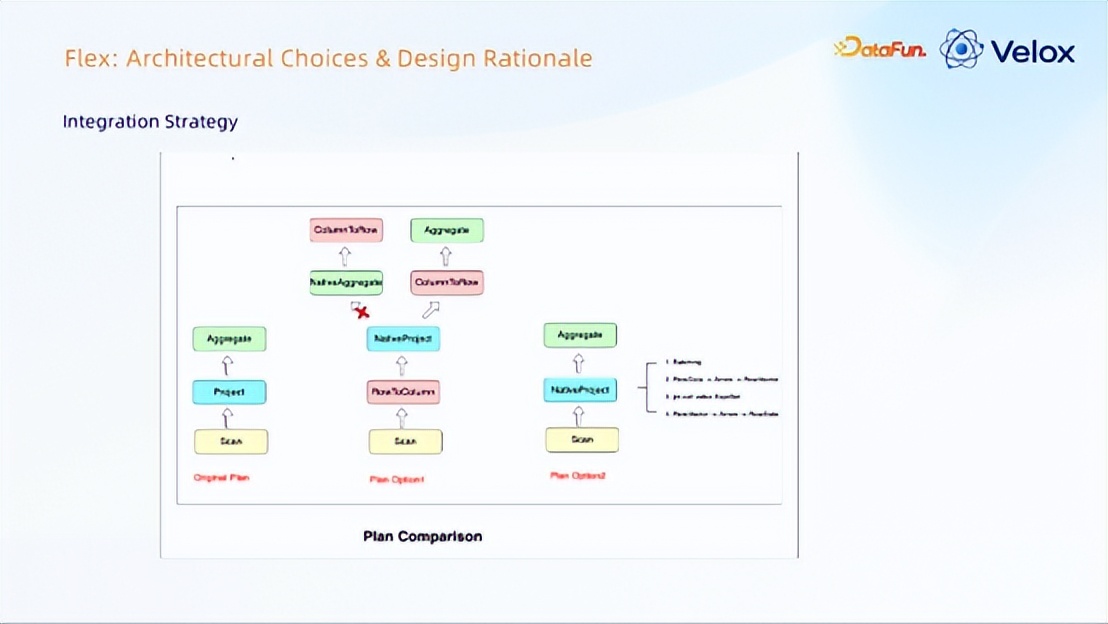 左边是 Flex 的 Original plan,若采用右边 Gluten Substrait Plan 的方式,得插入行转列列转行的算子;同时由于 Velox 不支持状态算子,若采用这种方案,工作量就比较大;尤其在人力少、资源比较紧的情况下,方案不太推荐。