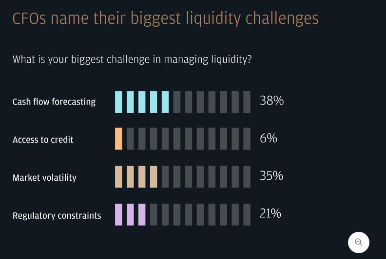 38%的首席财务官和财务主管认为现金流预测是2026年最大的流动性挑战,其次是市场波动(35%)。