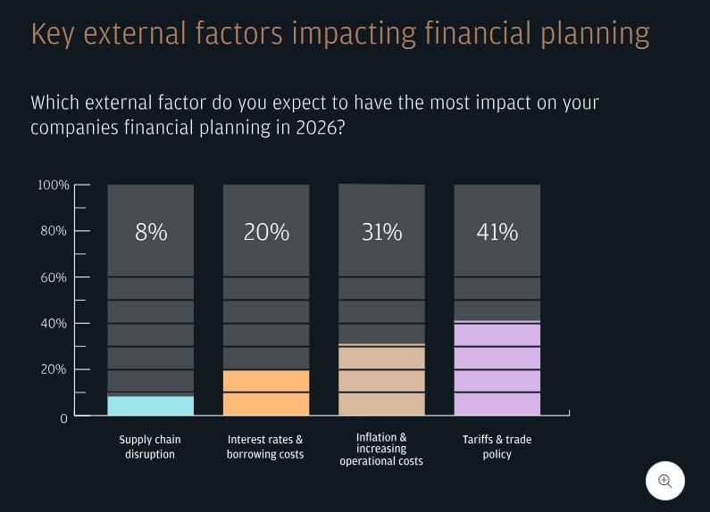 41% 的首席财务官和财务主管认为,关税和贸易政策预计将在 2026 年对财务规划产生最大的影响,其次是通货膨胀和不断上涨的运营成本。
