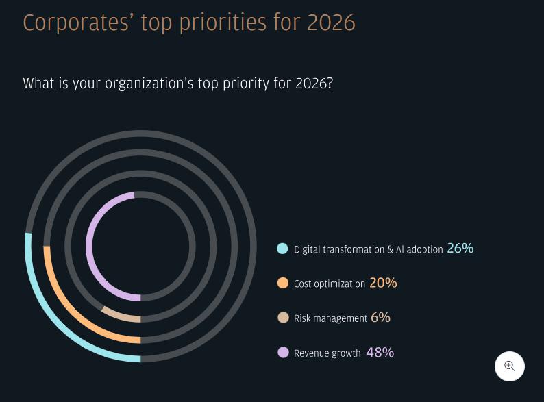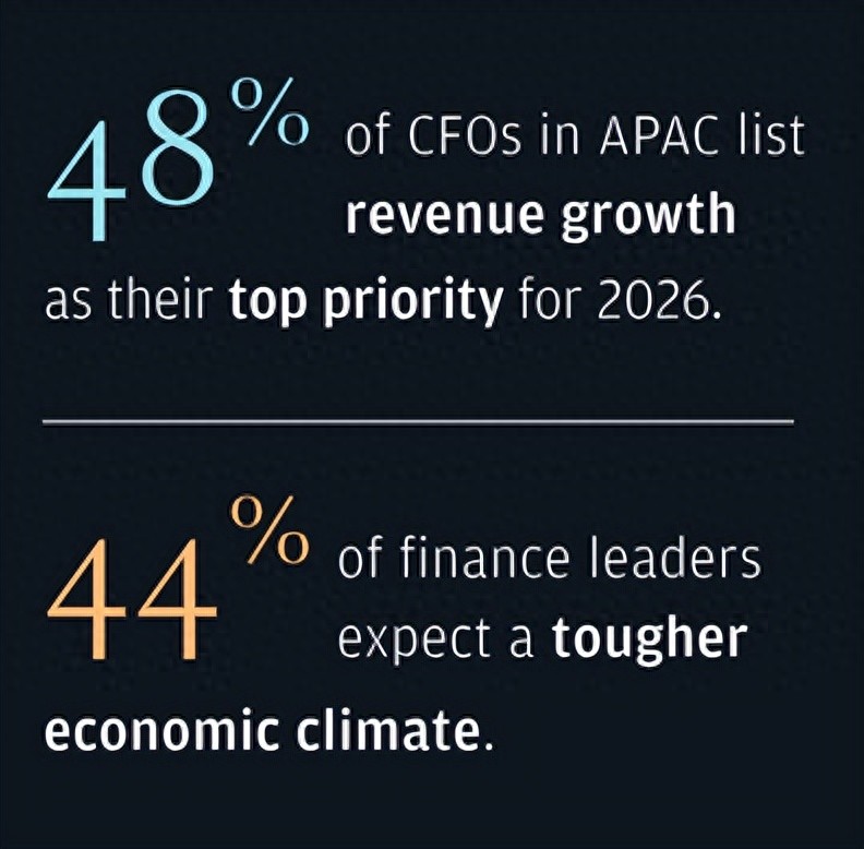 即便经济形势日益严峻,亚太地区的首席财务官和财务主管们依然将目光聚焦于增长。近半数(48%)的受访者表示,营收增长是他们2026年的首要任务,超过了数字化转型和人工智能应用(26%)、成本优化(20%)以及风险管理(6%)。许多企业正在寻求新的市场机遇,投资技术并精简运营——这些在2025年制定的战略预计将在未来一年推动业务扩张和增强韧性。