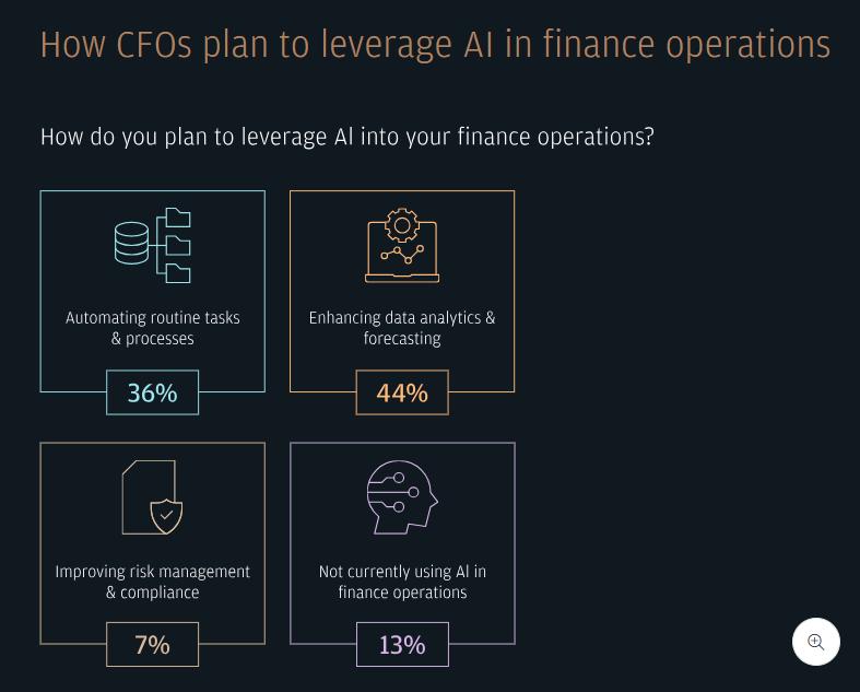 44%的受访者选择增强数据分析和预测作为首席财务官和财务主管计划在财务运营中利用人工智能的主要方式。