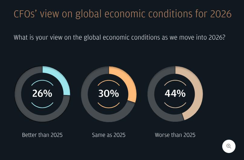 首席财务官和财务主管们对2026年全球经济前景持谨慎态度,44%的人预计情况会比2025年更糟,30%的人预计情况将保持不变,而26%的人预计情况会有所改善。