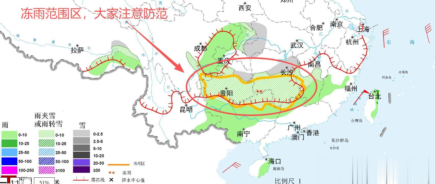 根据冰冻气象灾害黄色预警,今天白天也夜间,在贵州中东部和西北部、湖南中南部、广西北部、广东西北部、云南东北部、江西西部等地的部分地区有冻雨或冰粒,上述大部地区冻雨量1~2毫米。