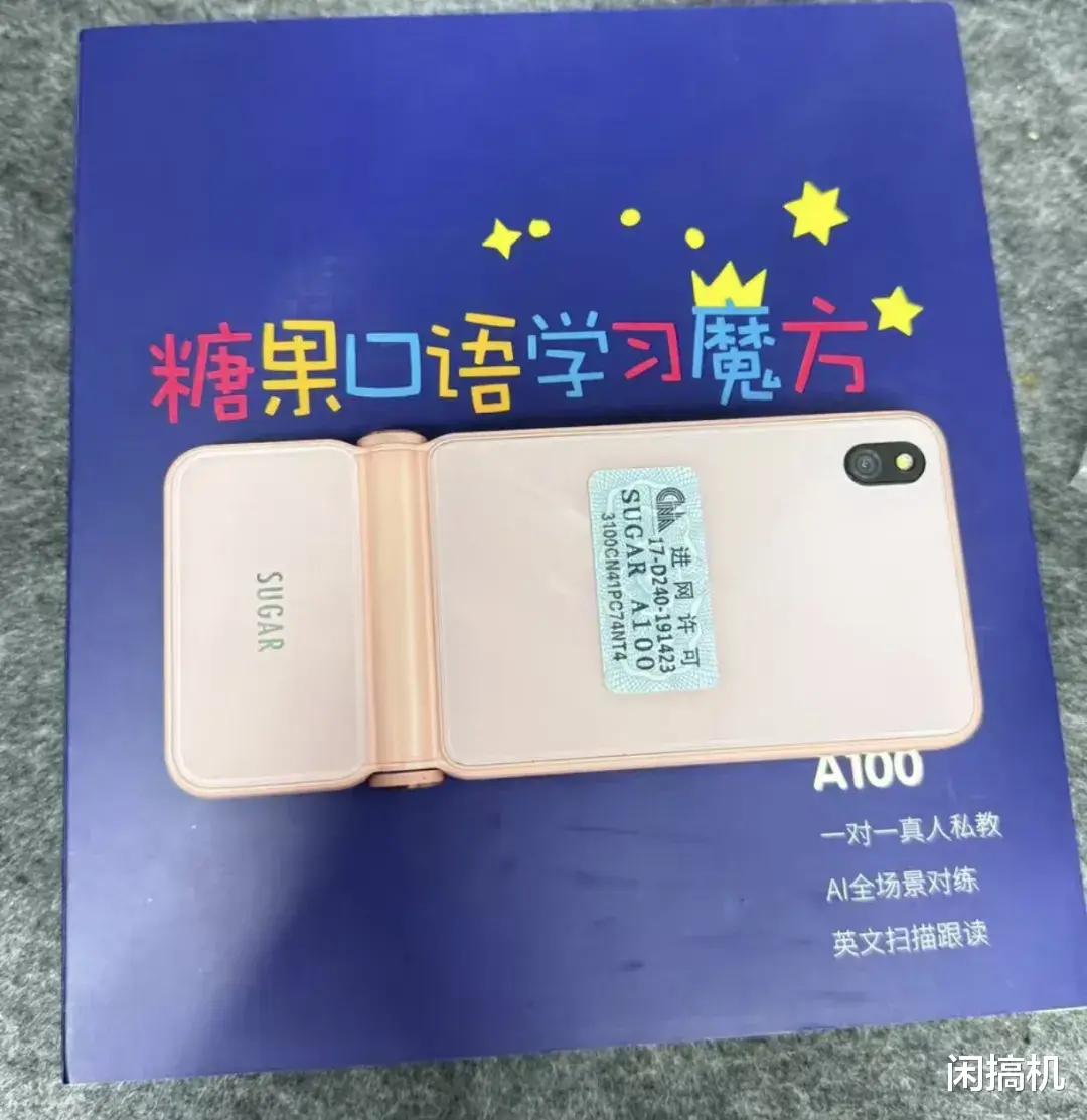 它是SUGAR在2019年推出的糖果A100口语学习机,官方定义为“翻译手机”,背面都贴着进网许可证,我查了支持全网通4G双卡双待。