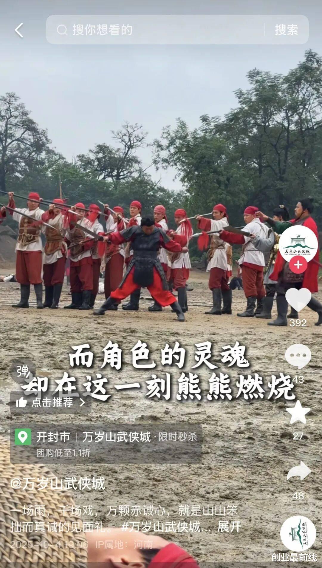 万岁山武侠城和清明上河园景区均位于河南省开封市。10月1日,开封在淅沥的雨夜中,仍有超万名游客在万岁山武侠城一同欢度假期,沉浸式打卡武侠文化景观,在这里,一天中拥有多至三千多场主题各异的演出。