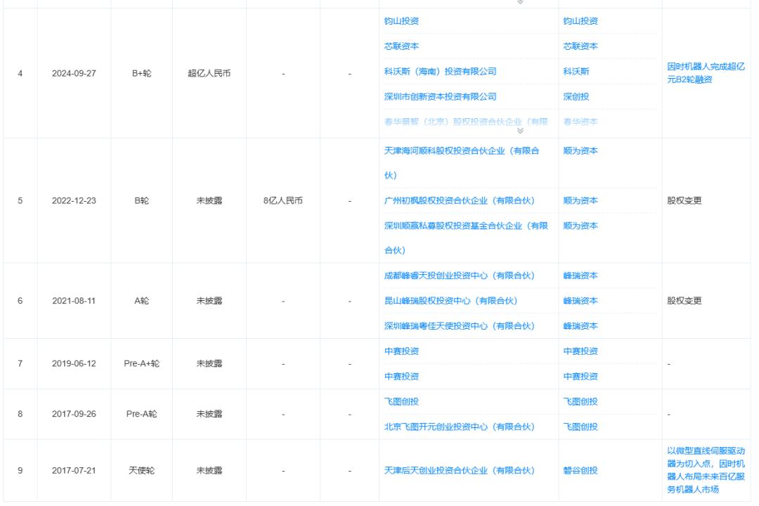 目前,包括天使轮在内,因时机器人已完成9轮次融资,背后投资机构包括:磐谷创投、飞图创投、中赛投资、峰瑞资本、顺为资本、科沃斯、芯联资本、钧山投资、华盖资本、铭哲资产、源禾资本、中金资本、成都科创投、达晨财智、神骐资本等。