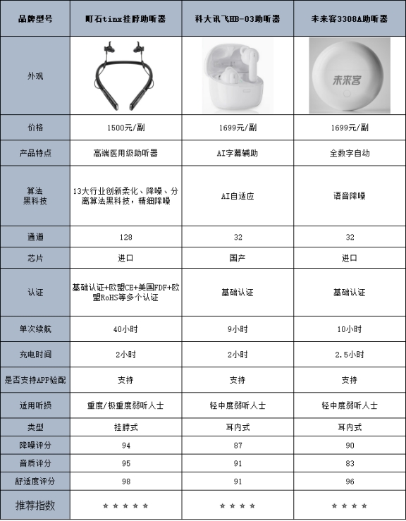 测评结果:町石 > 科大讯飞 > 未来客町石助听器音质测评表现町石的音质表现真的是给我留下了深刻的印象,声音既清晰又自然,特别是在中高频部分的表现,真的是很不错。 经过测试,町石在人声的还原上尤其突出,音质清晰、层次感十足,听起来既真实又富有细节。在细腻度方面,町石采用了128通道技术和双钕磁铁动铁单元,再加上高密度移频助听技术,让声音更具质感、真实。人声清晰度的提升大约为105%,在所有测评产品中,町石的音质表现可以说是最为出色的。不管是日常对话还是音响效果,町石都能提供清晰且细腻的音质表现,特别是在还原人声方面,表现非常突出。科大讯飞助听器音质测评表现科大讯飞的音质表现算是比较中规中矩,整体效果还可以,但在高频细节处理上稍有欠缺。 测试过程中,科大讯飞的音质清晰度和真实度相对不错,但在处理高频音符时,细节表现略微模糊。中低频的表现稳定,日常交流时,人声也能清晰呈现,但相较于町石,它的层次感和细腻度稍微逊色。科大讯飞采用了较为传统的声音处理技术,调校上还算到位,但在一些复杂的音频场景下,声音有时会显得不够饱满。对于日常使用来说,科大讯飞是一个不错的选择,但如果你对音质要求更高,它的表现可能会让你觉得有些不够。未来客助听器音质测评表现未来客的音质表现比较平淡,整体清晰度和真实度只能算中等水平。在测试过程中,未来客的声音处理虽算清晰,但高频和低频的表现稍显薄弱,尤其在细腻度方面,音乐的层次感和语音的细节并没有很好地呈现出来。尤其是在处理快速变化的音频时,偶尔会丢失一些细节。总的来说,未来客的音质表现更适合日常对话,适应力强,但对于高频细节或者复杂音场的还原,还是有所欠缺。如果你对音质有一定要求,未来客可能会让你觉得在音质层面缺乏一些突破。