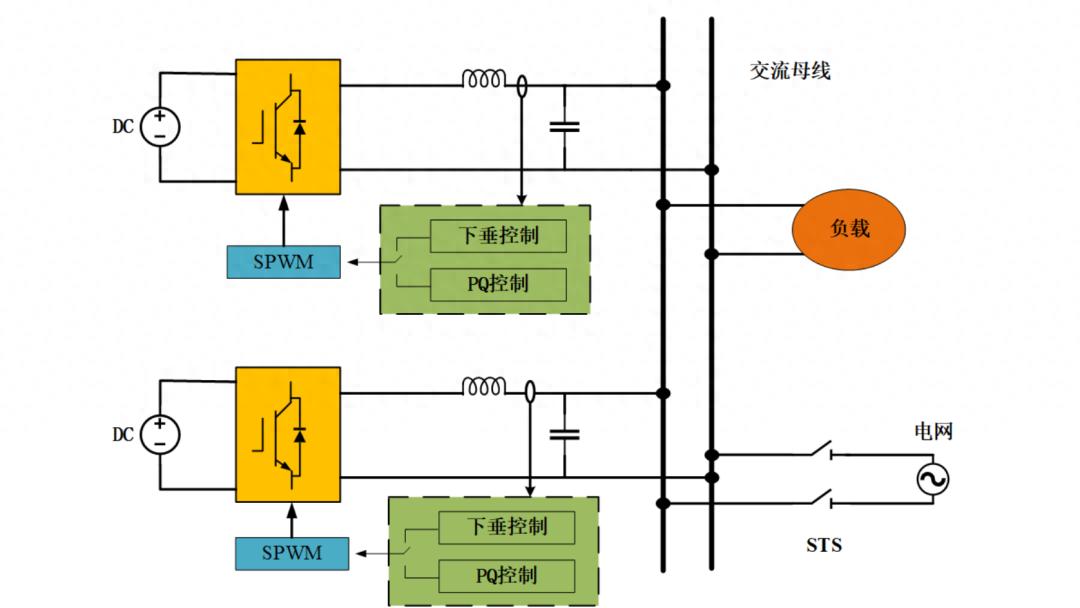 对等控制是一种分布式控制方式,其中微电网中的各逆变器在缺乏中央控制单元或通信网络支持的情况下,系统仍能实现自主运行和独立调控。这种运行模式不依赖于集中式控制架构或外部通信链路,而是通过本地控制策略和分布式算法来实现各单元之间的协调配合,确保系统在孤岛状态下仍能维持稳定运行,并完成既定的控制目标。在离网运行中,各逆变器通常采用下垂控制策略。下垂控制通过调节逆变器输出的电压和频率来分担负载,确保电压和频率在一定范围内稳定。在并网运行模式下,逆变器通常采用 PQ 控制策略,通过参考值进行调节逆变器侧的有功和无功输出,来实现与电网的稳定并网。具体来说,逆变器根据设定的功率目标输出相应的有功和无功,以满足电网的负荷需求和电压调节要求。具体结构如下图所示。