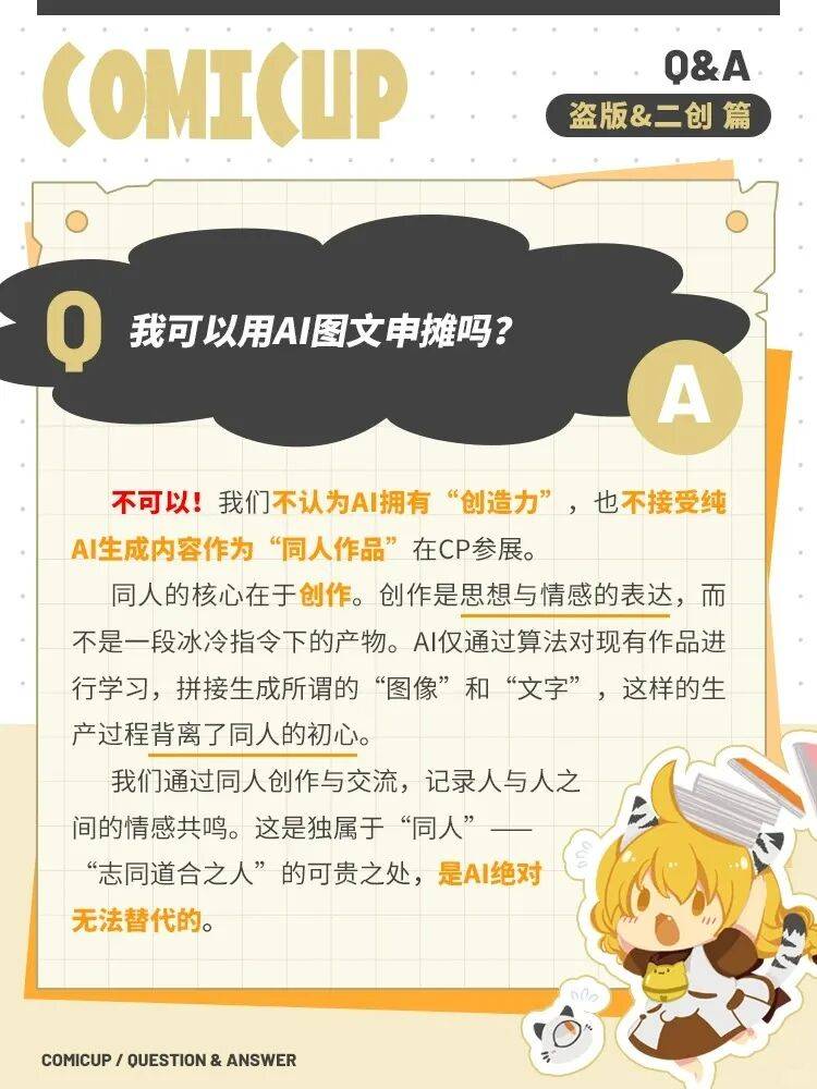 实际上,AI二创并未被同人领域全然接纳,国内最大同人展CP就明确表示“不接受纯AI生成内容作为同人作品在CP参展”。